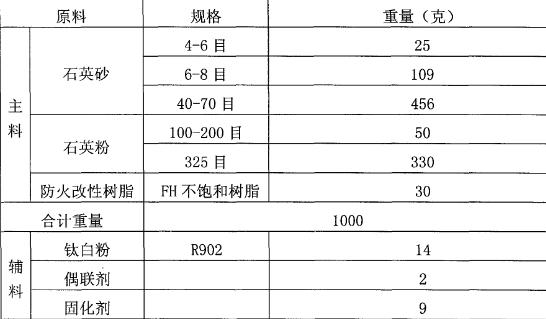 主料:4-6目石英砂0?4. 5%,6-8目石英砂0?12%、16-26目石英砂0?55%、 40-70目石英砂0?58%、100-200目石英粉3.5%?31%、325目石粉25%?65%、防火改性樹(shù)脂2. 5%?6.7% ;
